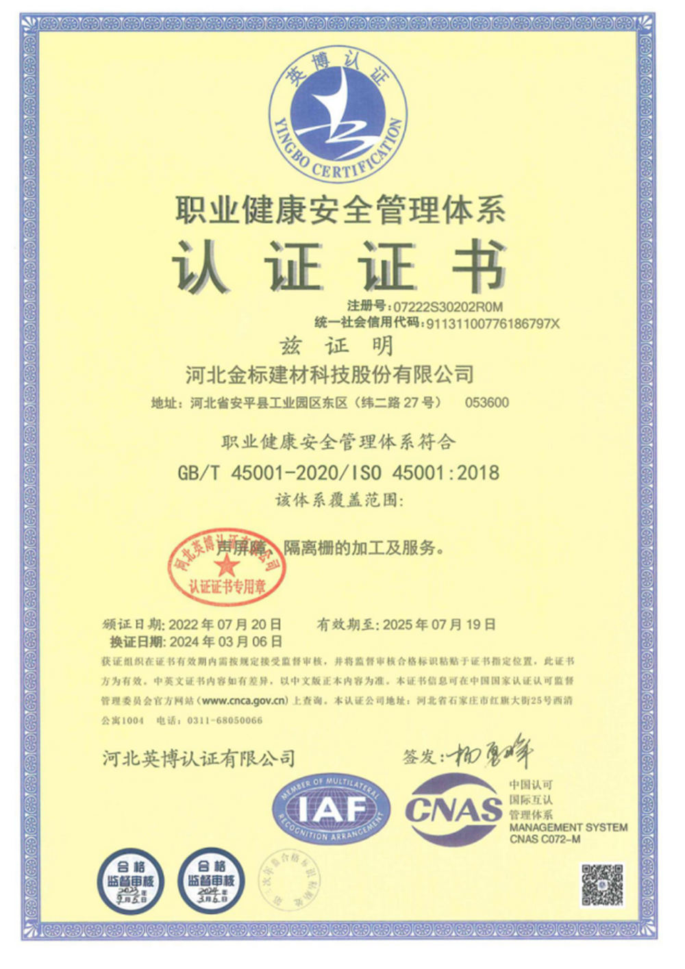 河北金標(biāo)建材科技股份有限公司成立于2005年,1998年開始建廠生產(chǎn),是一家國內(nèi)較早從事交安材料的專業(yè)生產(chǎn)廠家之一;公司占地200萬畝,擁有員工400余名,注冊資金6040萬, 已通過ISO9001質(zhì)量管理體系認(rèn)證,具備產(chǎn)品批量生產(chǎn)合格證、多項(xiàng)檢測報告等,先后獲得“AAA級信用企業(yè)”、河北優(yōu)秀企業(yè)”等殊榮。公司業(yè)務(wù)經(jīng)營范圍包括高速公路、鐵路聲屏障生產(chǎn)基地;隔離柵,防護(hù)柵欄、刺鐵絲生產(chǎn)基地。